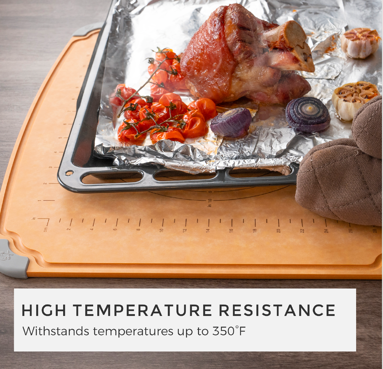 - Withstands temperatures up to 350°F, doubling as a trivet to shield your countertop from hot pots and pans.