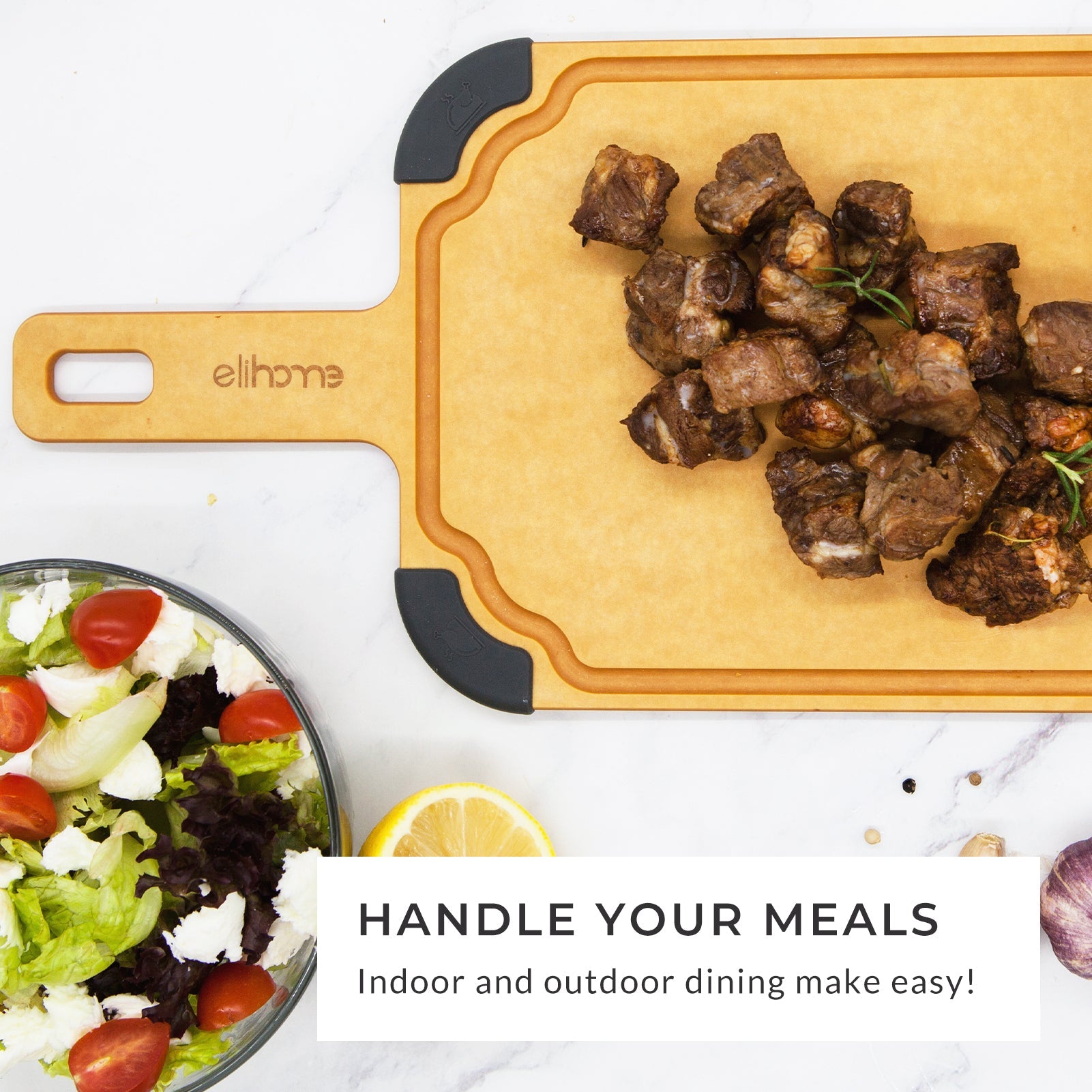 Designed with a built-in handle, this board is easy to grip, carry, and transport from kitchen prep to serving. The paddle-style design makes it a versatile kitchen tool, perfect for use as a cutting board, charcuterie board, or serving tray.