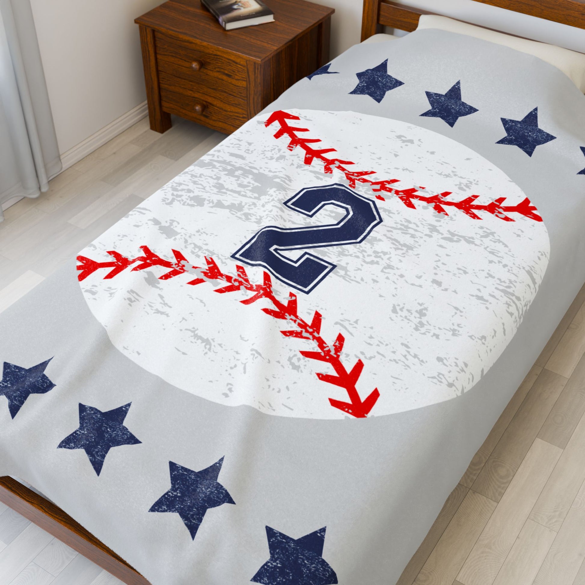 Curl up under a soft velveteen blanket that feels like a quiet evening at the ballpark. The design centers on a gently weathered baseball with bold red stitching, a navy number 2 at its heart, and a row of navy stars framing the top and bottom — nostalgic and spirited without shouting. The fabric is plush and medium-weight, draping easily over laps or across a couch while keeping its vibrant print on one side. Finished with reinforced double-needle seams, this blanket holds up through game nights, travel, and everyday lounging. It’s made for adults who love the slow comfort of familiar team memories, late innings, and cozy sidelines.